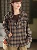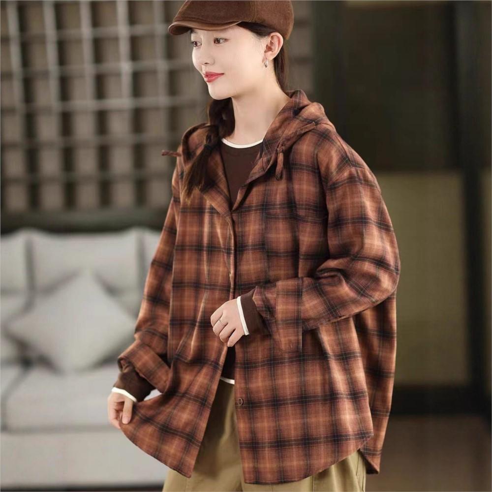 Johnature Women Vintage Plaid Shirts Hooded Autumn Blouses Button Long Sleeve Loose Cotton Soft Female Casual Shirts