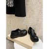 Eine Frau trägt ein Paar Retro-Schuhe mit großen Köpfen, runder Zehenpartie und rutschfesten Sohlen.
