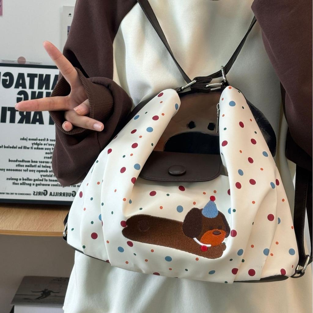 Puppy Tote Bag Cute Single Shoulder Crossbody Backpack Polka Dot Bag Niche Versatile Cartoon Coffee Color One Bag Three Ways to Carry