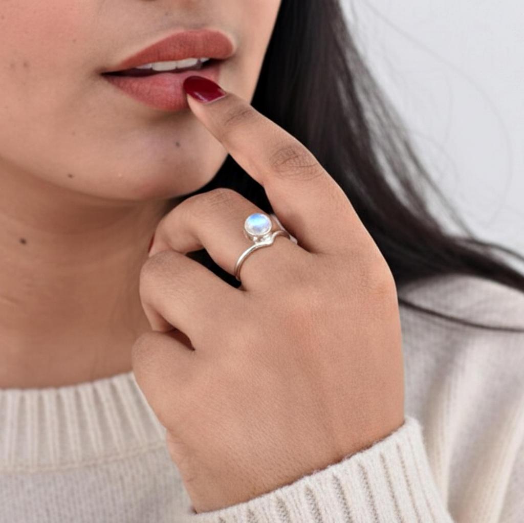 Regenbogenmondstein Runder Statement-Ring, 925 Sterlingsilber, Boho Minimalistischer Ring für Damen