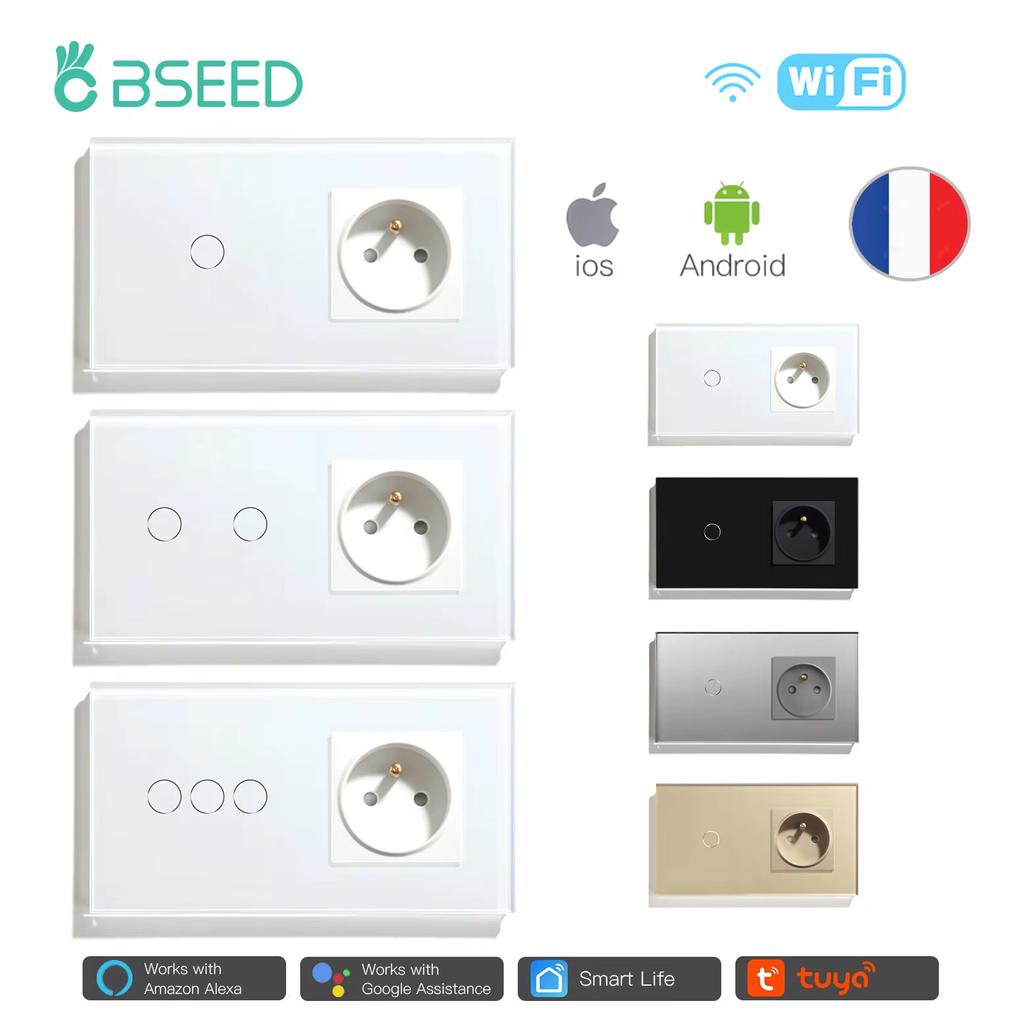 BSEED WLAN Touchschalter 1/2/3fach mit normaler FR-Steckdose Glasplatte Smart Wandschalter für Licht Tuya APP Steuerung Blaue Hintergrundbeleuchtung