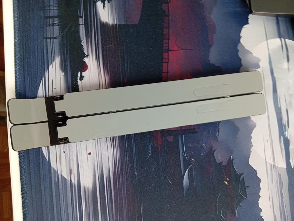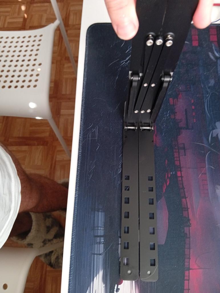 Die Qualität des Produkts ist ausgezeichnet, für diejenigen, die es interessiert: Die ovalen Löcher sind mit Klebeklettverschlüssen versehen. Wenn man den Ständer schließt und öffnet, bleiben sie offen und müssen theoretisch nachgebessert werden. Mit der Zeit wird der Kleber abnutzen und man wird sich etwas überlegen müssen. Ansonsten ist die Qualität großartig. Mein 2,5 kg und 16-Zoll-Laptop wird problemlos gehalten. Wenn Sie jedoch einen größeren oder schwereren haben, empfehle ich ihn nicht, da die Konstruktion schmal ist. Ich habe ihn aus Metall und nicht aus Aluminium gekauft, weil er stabiler ist.