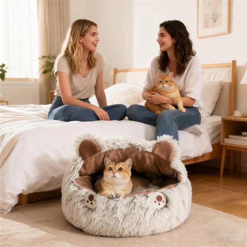 Verbesserter Entspannungsbereich für Haustiere: Die Katzenbett-Höhle kombiniert eine sichere, halbgeschlossene Form mit einem weichen Inneren und bietet schüchternen Haustieren ein perfektes Gleichgewicht aus Schutz und Entspannung, während sie als ihr privater Ort zum Schlafen und Spielen dient.. Vorteil Gemütliche Wärme: Die Katzenhöhle wurde entwickelt, um weichen Halt zu bieten, und verwendet eine hochdichte PP-Baumwollfüllung, kombiniert mit hautfreundlichem Samtstoff, der eine hohe Wärmespeicherung gewährleistet und die Körperwärme Ihrer Katze einschließt, um bei kühlen Wetterbedingungen zusätzlichen Komfort zu bieten.. Süßer Ruheplatz-Upgrade: Das überdachte Katzenbett verfügt über niedliche Bären- und Hasenmotive mit 3D-Ohrendekoration, wodurch eine verspielte Wohnatmosphäre geschaffen wird und Haustiere zum bequemen Ausruhen animiert werden.. Vielseitige Haustier-Komfortzone: Dieses Katzenbetthaus bietet einen geräumigen Innenraum, der vielseitige Ruhepositionen unterstützt und Haustieren uneingeschränkte Bewegung und erhöhten Komfort gewährleistet, perfekt für Haushalte mit mehreren Katzen oder Hunden, die gemütliche Entspannungsplätze suchen.. Zuverlässige Ruhe-Stabilität: Ausgestattet mit einer rutschfesten Basis und strukturierten Granulaten, bietet das Katzenkuppelbett verbesserte Stabilität bei Aktivität des Haustiers, hält das Bett auf allen Böden fest an Ort und Stelle und fördert ein sicheres Schlaferlebnis, ideal für Haustiere in dynamischen Haushaltsumgebungen.