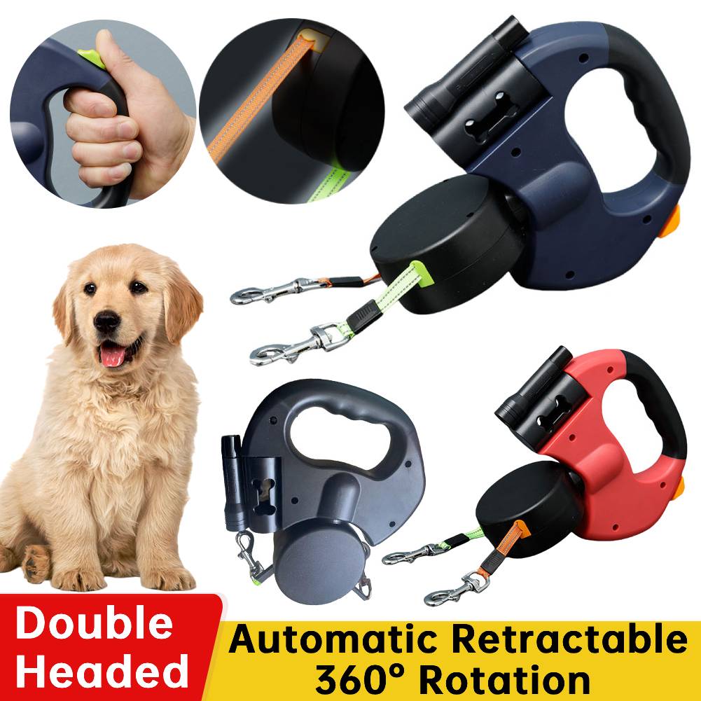 Doppelköpfige Hundeleine Zugseil 360 Grad drehbar Doppelte Haustierleine mit LED-Licht Einziehbare Hundeleine für 2 Hunde