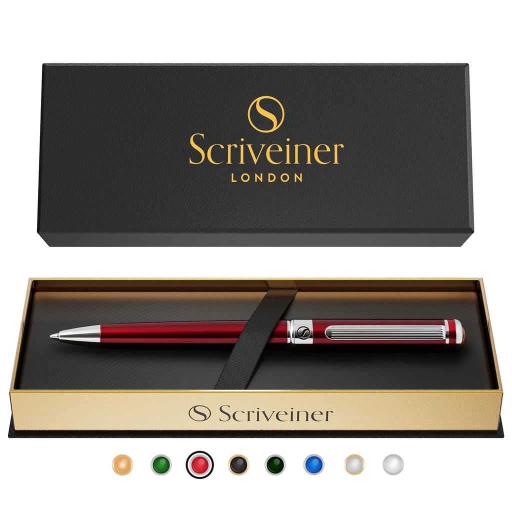 Scriveiner Luxury Ballpoint Pen This heavyweight luxury pen is beautifully crafted from brass with a red lacquer finish and silver chrome accents. This level of craftsmanship and materials is usually found in pens costing many times more. This pen looks great anywhere. Whether in a boardroom, a cafe or on the street, this pen will attract attention and compliments. Great Writing Experience Our pens use Schmidt refills made in Germany. You will experience a smooth writing experience. Our pens produce a beautiful handwriting.