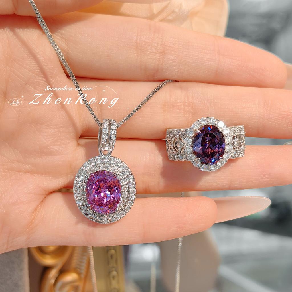 Classic Luxury Aaa Zirconia Color Jewelry Sets For Women Elegant Pink Cz Pendant Necklace Rings Female Anniversary Gift