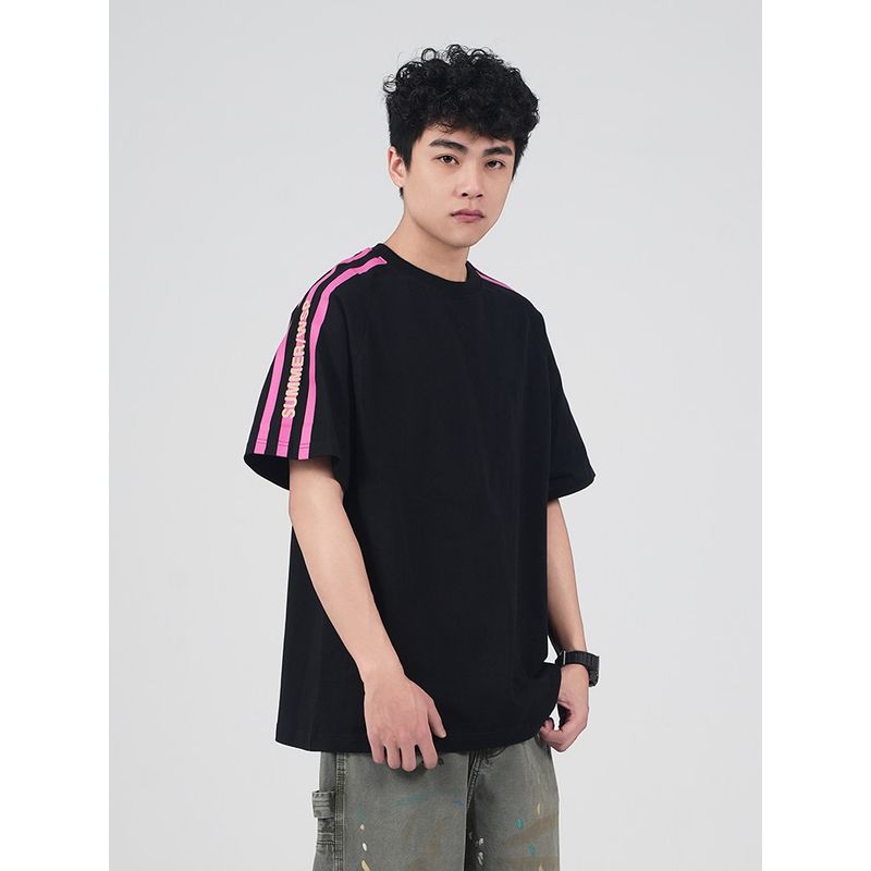 Wassup American-Style Sports Three-Stripe Letter Striped T-Shirt Short-Sleeved Men's Summer New Trendy Brand Heavyweight Couple Outfit