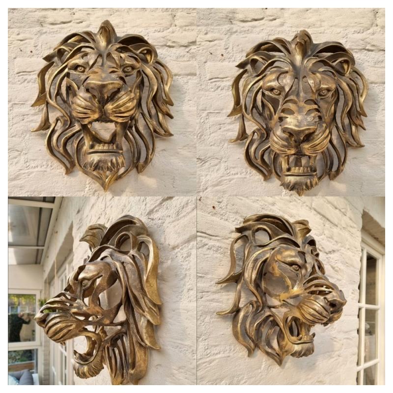 Wanddekoration Löwenkopf aus Kunstharz, goldene, ausgehöhlte Löwenkopf-Kunstskulptur, geeignet für den Eingangsbereich, die Türwand oder den Zaun.