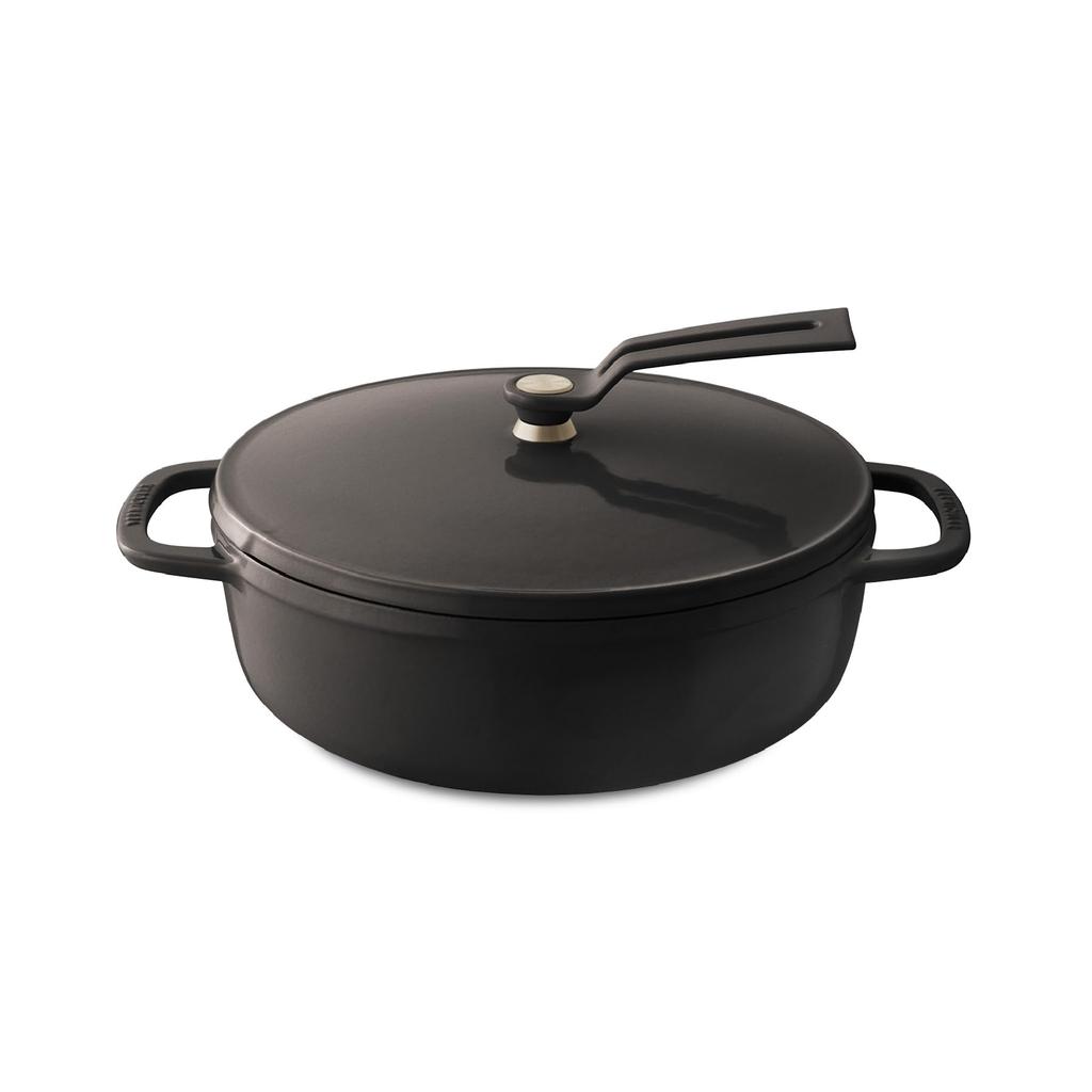 Vermicular 22 cm flacher Gusseisen-Emaille-Topf in Haselnussbraun zum Kochen und Backen ohne Wasser, inklusive Rezeptbuch, 2-teilig, freistehend