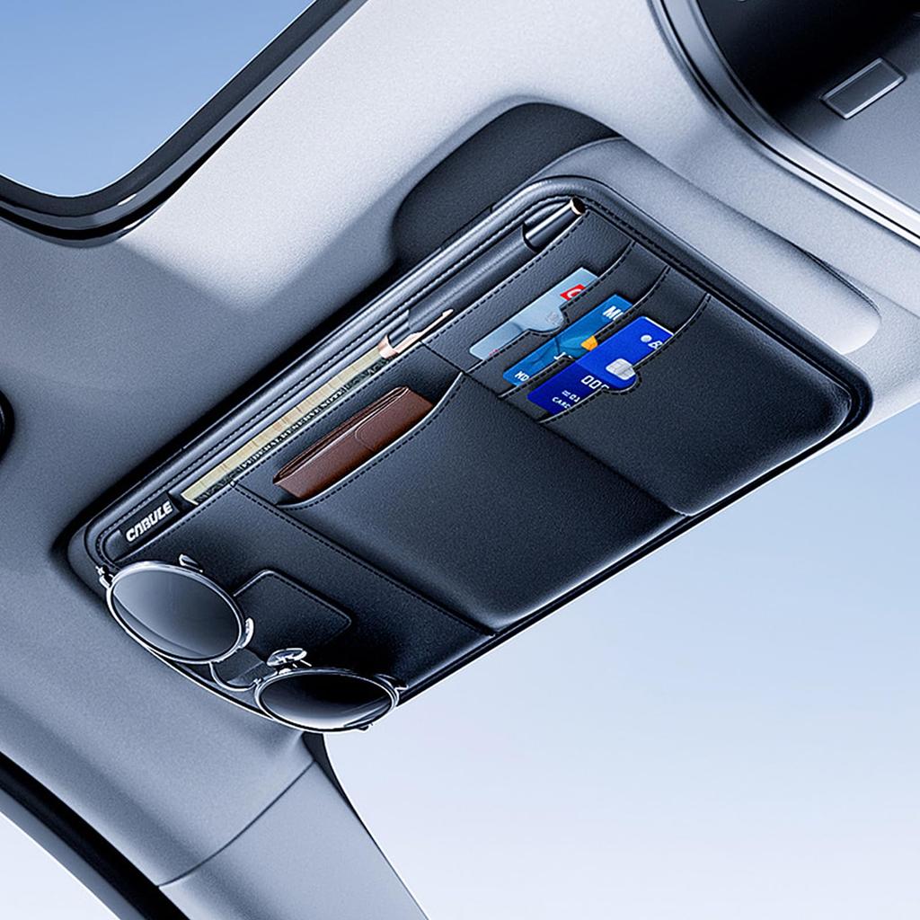 [Multifunctional] This sunshade storage bag can be separated into two sections: a card storage clip and an eyeglass clip. The eyeglass clip features a magnetic suction design that can securely hold glasses and easily accommodate various types of glasses, whether they are myopia glasses or sunglasses. The storage clip features a divided storage design, making in-car storage more convenient and eliminating clutter. The separate pass holder can also hold cards, coupons, coins, fuel cards, USB cables, and more, allowing drivers to quickly access and store items when needed.