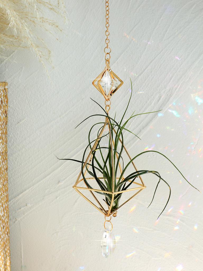 Garten-Sonnenfänger Gold Hängender Luftpflanzenhalter Tillandsia Luftpflanzen Aufhänger Luftfarn Display Pflanzgefäß mit Kristall Heimdekoration