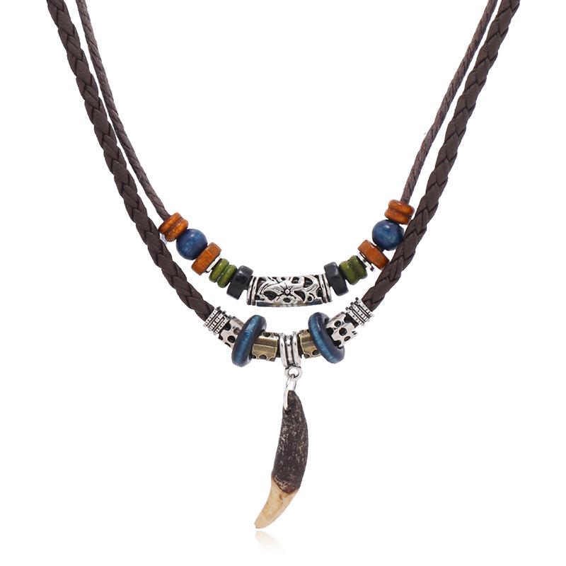 Vintage Ethnischer Hundezahn Anhänger Herren Mehrlagige Lederkette