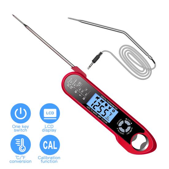 Die 5,1 Zoll lange drehbare Sonde wird für Fleisch/Flüssigkeit verwendet.. Die 6,4" lange, extra lange, gebogene Drahtsonde kann im Ofen/Grill/Räucherofen verwendet werden.