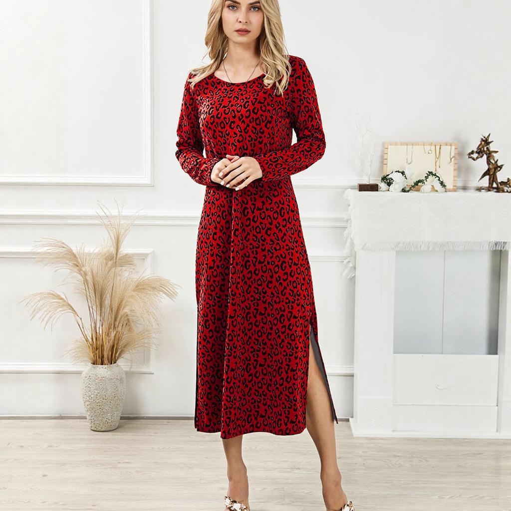 Woman Spring Fall Cocktal Dresses High Waisted Long Sleeves Leopard Printed Round-Neck Vintage Casual Ladies Maxi Dress
