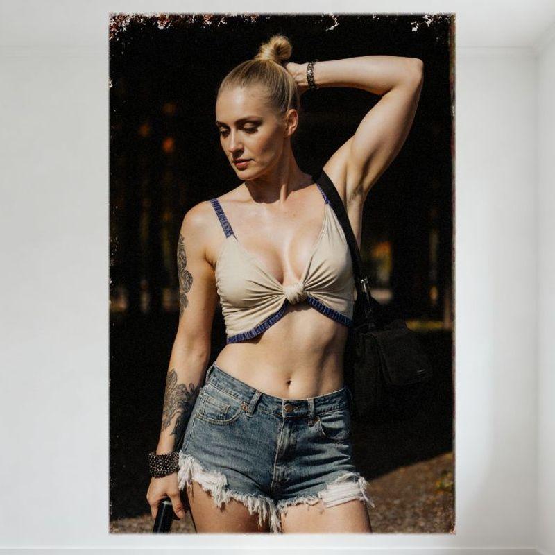 Sexy Blonde High Bun Woman Outdoor Pose Tin Sign Vintage Metal Poster for Bar Pub Home Cafe Wall Decor Beige Crop Top Blue Short