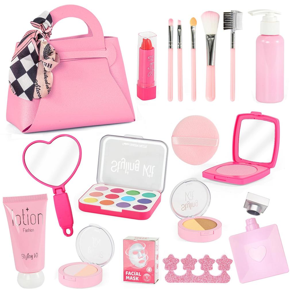 This gorgeous pink makeup set for kids includes eyeshadow, lipstick, blush, brushes, empty bottles, a mirror, and more, allowing for fun and realistic makeup play. Made with gentle materials for sensitive skin, it features rounded corners for safety. Durable and long-lasting play. A perfect birthday or Christmas gift, it also comes with a convenient and stylish storage bag, making it easy to carry and store away when traveling.