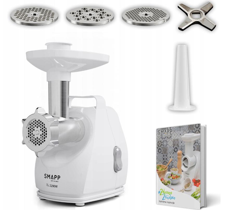 NEU!!! SMAPP 490.81 2200 W Weißer Fleischwolf mit Zerkleinerungsfunktion und zuverlässigem ZELMOTOR-Motor TECHNISCHE DATEN: 4⃣ Gummifüße, rutschfeste Kammergröße Nr. 8⃣, 3⃣ Schleifsiebe, Ersatzkupplung, leistungsstarker, verbesserter Motor mit 2200 W* Leistung. Warum direkt beim Hersteller kaufen? 3⃣ Als Hersteller verfügen wir über alle Ersatzteile und Zubehörteile.