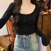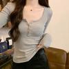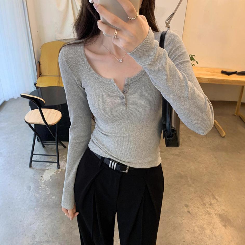Reines Verlangen U-Ausschnitt T-Shirt Damen Vorderseite Schulter Langarm Herbst Slim Fit Vielseitig und dünn Halboffener Ausschnitt Unterhemd Oberteil Damen