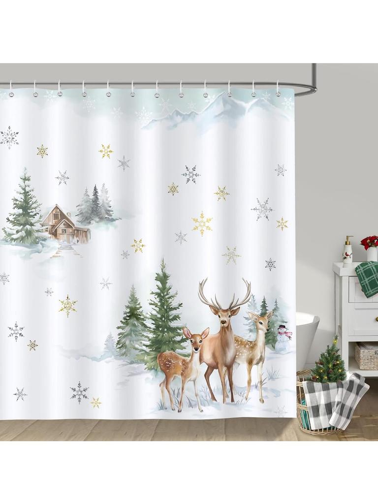 Winter Hirsch Duschvorhang, Verschneite Kiefernhütte Schneeflocke Weihnachten Badezimmer Vorhang Polyestergewebe Wasserdichter Badvorhang