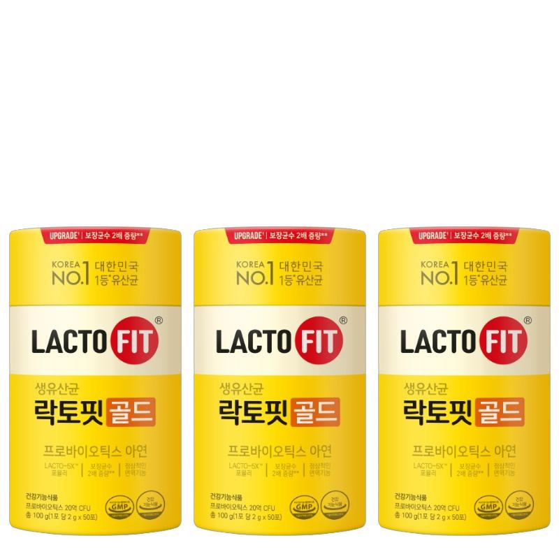 Lacto-Fit Gold Daily Probiotic is a convenient stick-type probiotic supplement formulated to support digestive balance, healthy bowel movement, and overall gut wellness. Each bottle contains 50 individually packed powder sticks (total 150 sticks in this 3-bottle set), designed for easy daily intake without water. This formula combines multiple probiotic strains with prebiotics to help maintain a healthy intestinal environment for both adults and children.