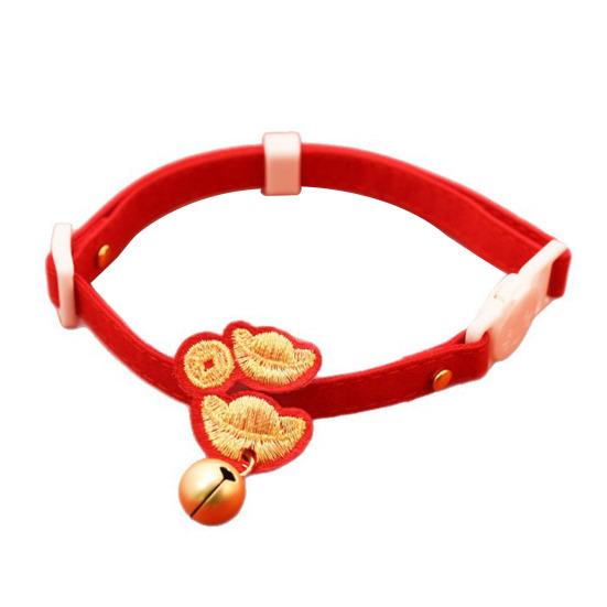 Geschmückt mit rotem Stoff und golden gestickten Glückskatzen, Goldbarren und festlichen Elementen, ergänzt durch eine knackige kleine Glocke, symbolisiert dieses Halsband Glück für das Neue Jahr.. Die Stickerei und die Glocke sind sicher befestigt, um aktivem Spiel standzuhalten, ohne abzufallen.. Leicht und langlebig, bietet es sowohl Stil als auch Praktikabilität für den täglichen Gebrauch oder Spaziergänge.