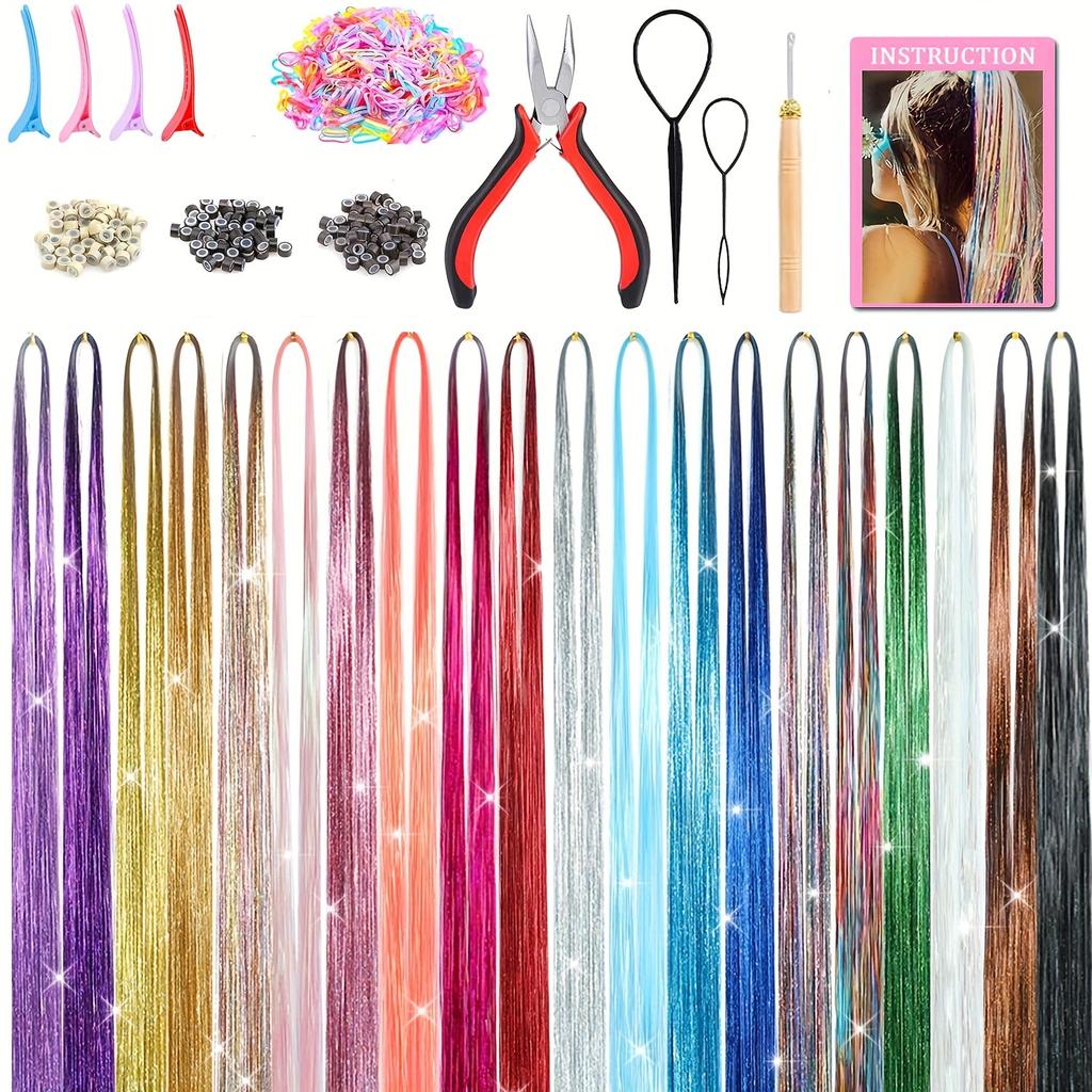 high quality6000 Strands Hair Tinsel Kit, 20 Colors, Glitter Heat-Resistant Hair Extensions, Fairy Hair Sparkle Tool Set, for Women & Girls, Party