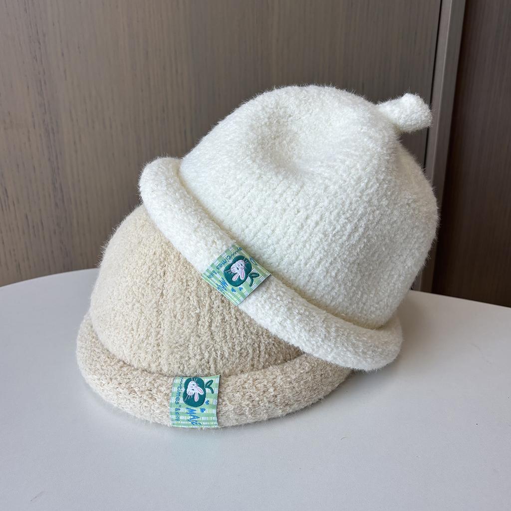 Cute Rabbit Sticker Crimped Wool Hat Lady Cute Sweet Little Pull Top Hat Autumn And Winter Outdoor Warm Knitted Hat