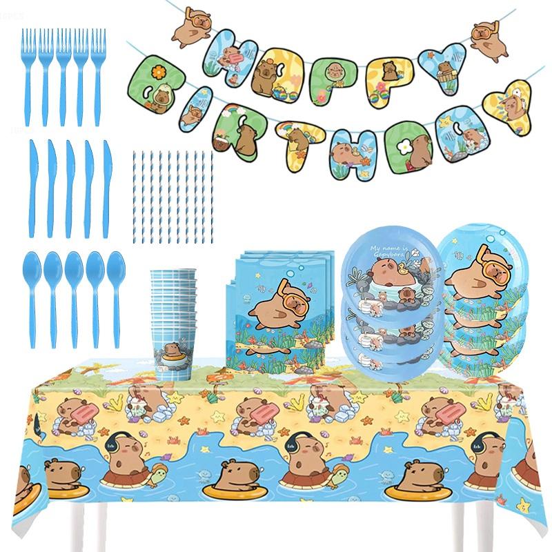 Capybara Theme Disposable Tableware Set Cartoon Capybara Tablecloth Cups Plates Napkin Happy Birthday Banner Kids Party Supplies