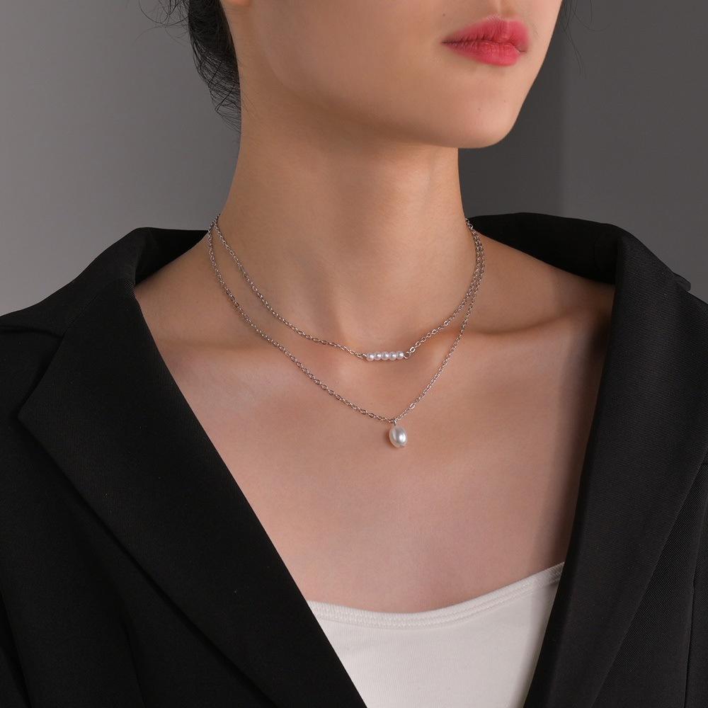 New Personality One-word Pearl Pendant Women's Double Stacked Alloy Necklace Clavicle Chain