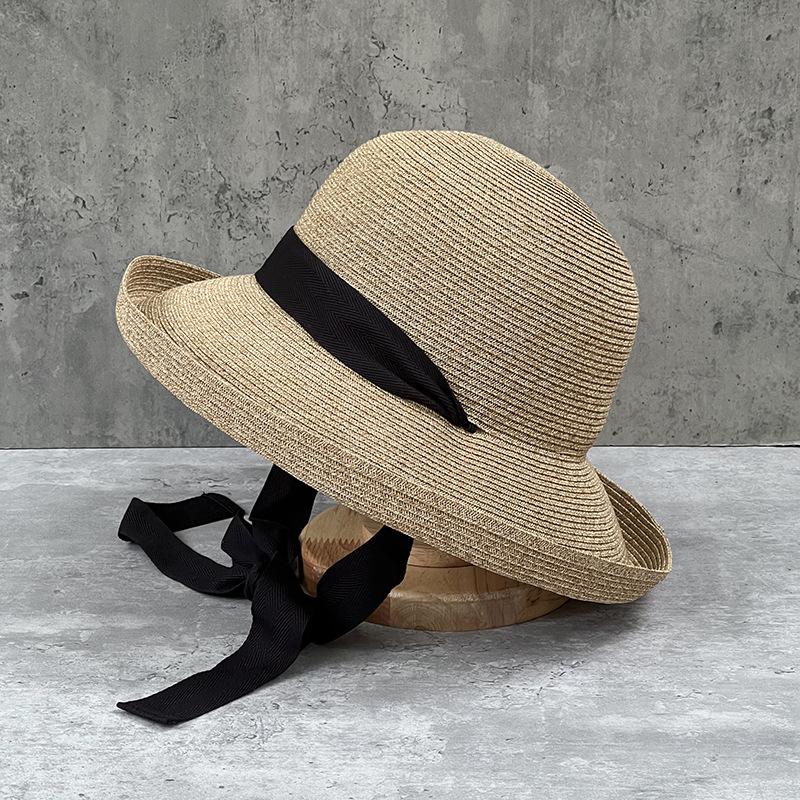 Japanese Straw Hat Women'S Foldable Sunscreen Hat Crimped Basin Hat Bucket Hat Sun Hat Summer Hat Long Strap