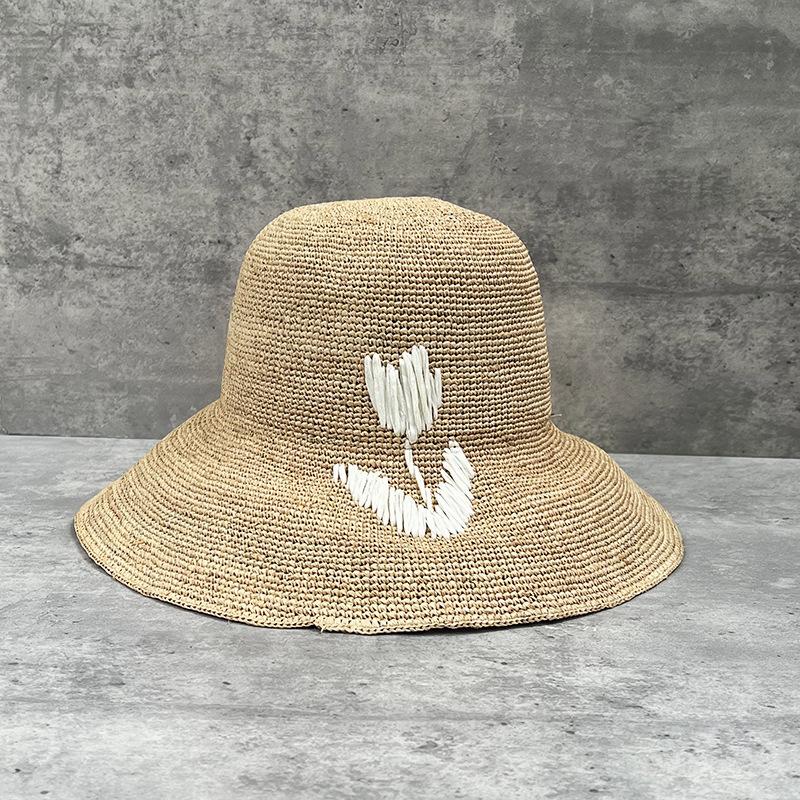 Thin Lafite Straw French Bucket Hat Women'S Big-Brimmed Straw Hat Tulip Handmade Crochet Vacation Beach Sun Hat