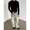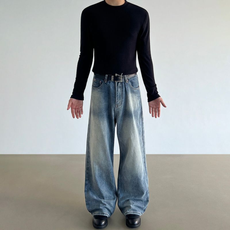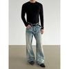 Blaexit American-Style Cleanfit Washed Light Blue A-Line Wide-Leg Jeans for Men, Straight-Leg Slightly Flared Vibe Pants