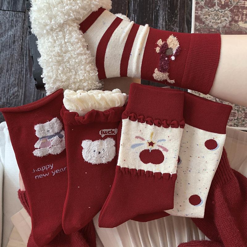Berry Red Series Socks Season Korean Bear Versatile Stacking Socks New Year'S Socks