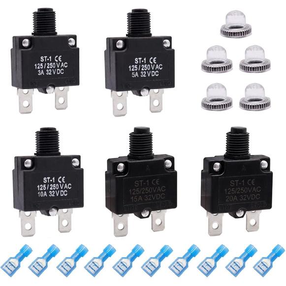 Package Includes: 5 PCS thermal circuit breakers(3A,5A,10A,15A,20A)+5 PCS Waterproof Button Caps +10 PCS Quick Connect Terminals