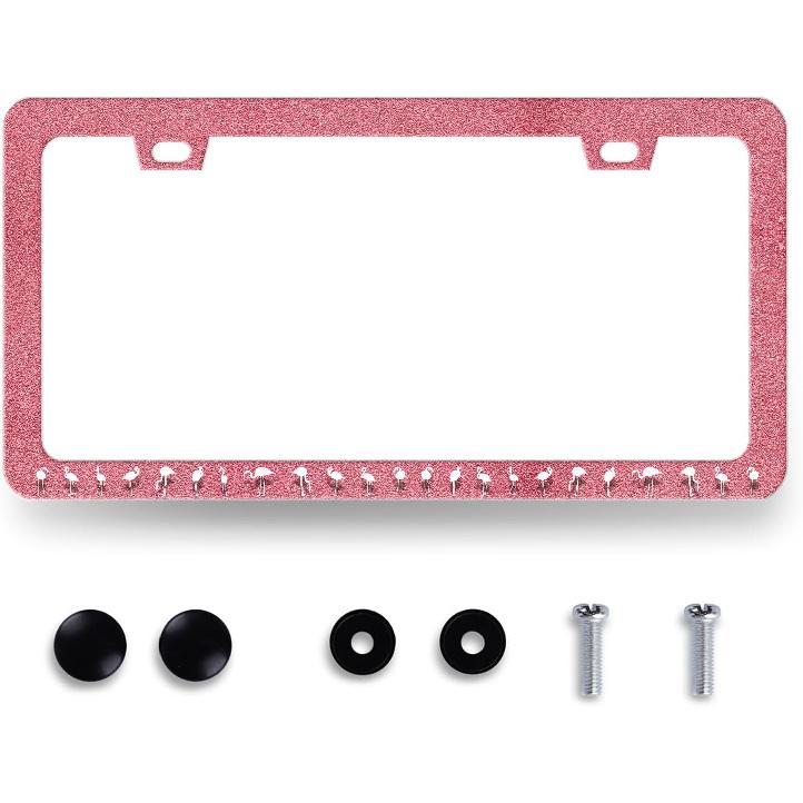 Pink Flamingo License Plate Frame Beautiful Glitter Animal License Plate Holder For Car Decorative Stainless Steel Colorful License Plate Flamingos