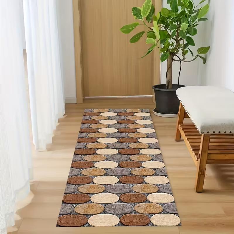 Stone-Inlaid Mosaic Carpet, Round Pattern Array in Earth-Tone Palette Rug, Textured Floor Mat for Modern Entryway Decoration