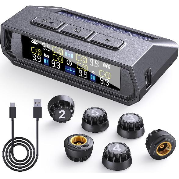 【Solar Powered+ USB Dual Charing】:Our TPMS Sensor combines solar and USB charging for all day power. It fully charges in 2 hours on sunny days and can also be charged via USB on rainy days, ensuring at least 7-10 days of use. Travel worry-free, no matter the weather.