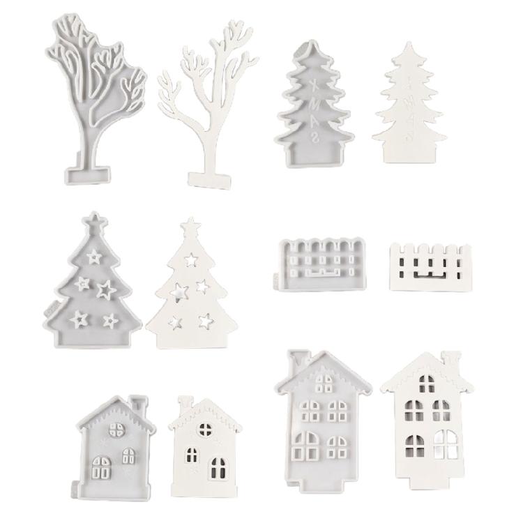 Einzigartige Silikon-Kerzenhalterformen mit Weihnachtsmotiv in Form von Weihnachtsbaum, Zaun und Haus, sehr geeignet für die Herstellung von Kerzenhaltern, Kuchen, Schokolade, Fondantdekoration, Weihnachtsdekoration, Heimdekorationen, Epoxidharzprojekten.