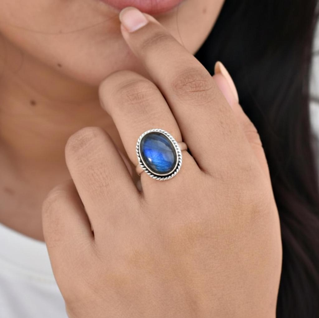 925 Sterlingsilber Labradorit Ovaler Cabochon Ring, Boho Minimalistischer Blauer Schimmer Edelsteinschmuck, Geschenk für Sie