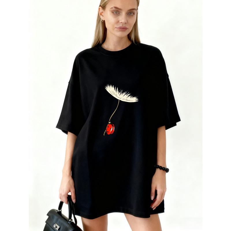 Übergroßes T-Shirt-Kleid Schwarz Marienkäfer mit Federdruck Lässige Streetwear-Mode für Frauen