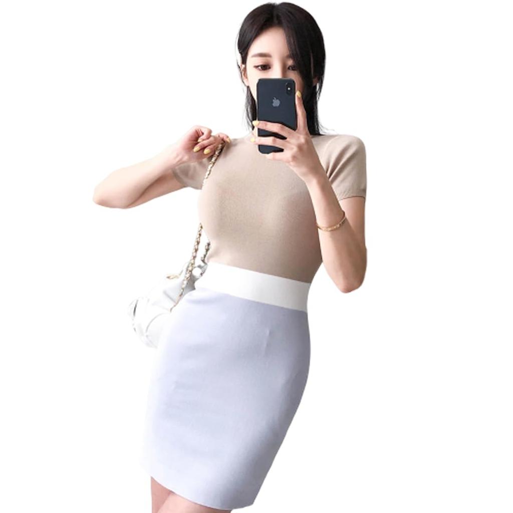 GRAXIA Knitted Mini Tight Perfect for Hostess and Short One Size Fits Beige and Gray Women's Dress, Fit, Hostesses, Clubs, Lounges, Sleeves, Stretchy,