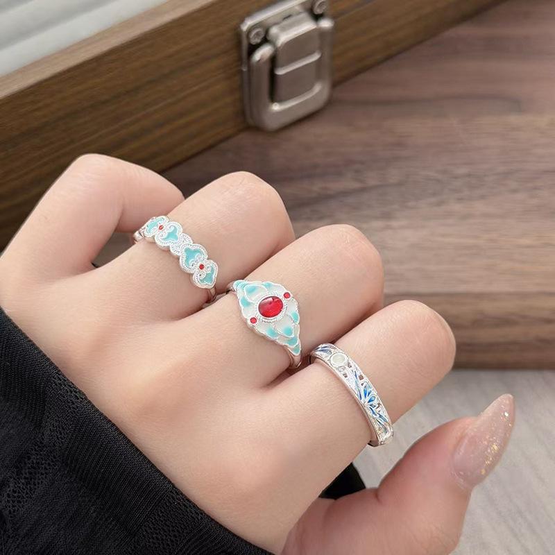 Ethnisch Stil Emaille Meeresblau Tropföl Blume Öffnungsring Damen Nische Leichter Luxus Exquisit Stapelring