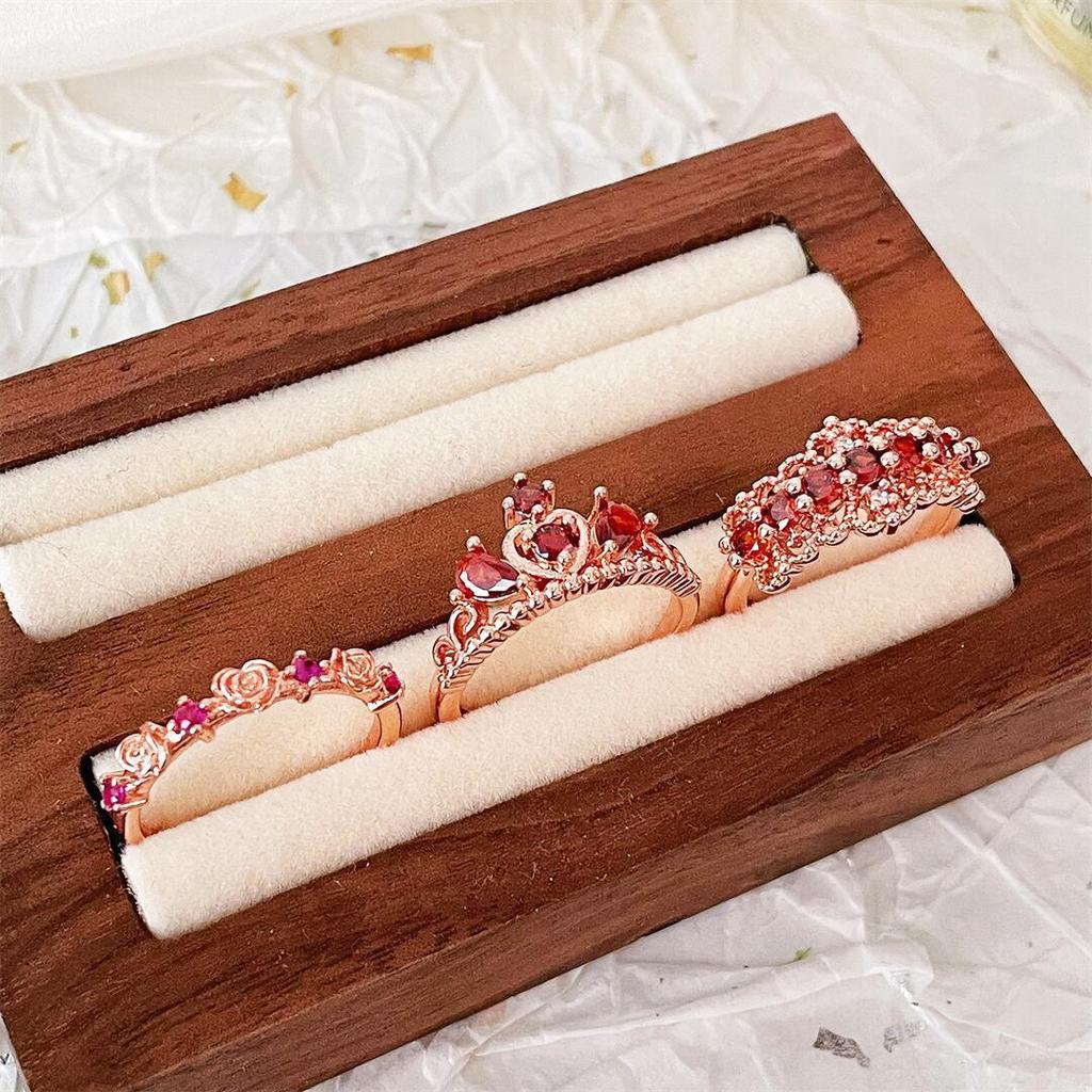 Vintage Rose Gold Open Crown Flower Ring Princess Style Niche Design High Personality Red Colored Treasure Ring