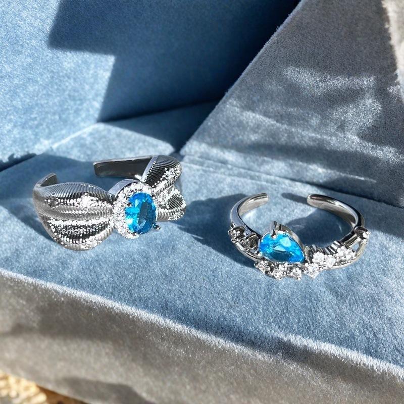 Super Flash Sweet Sea Blue Zircon Brushed Bow Open Ring Temperament Index Finger Ring Light Luxury High-End Ring