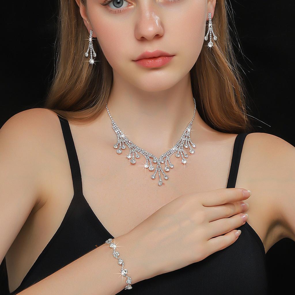 Exaggerated Full Diamond Bracelet Collarbone Chain Pearl Necklace Stud Earrings Women'S Jewelry High-End Women'S Light Luxury Set