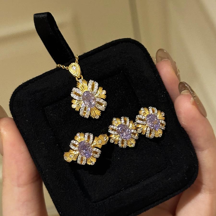 Vintage Bauhinia Ribbon Ring Noble And Elegant Purple Zircon Necklace Temperament Exquisite Stud Earrings Haute Couture Color Treasure Set