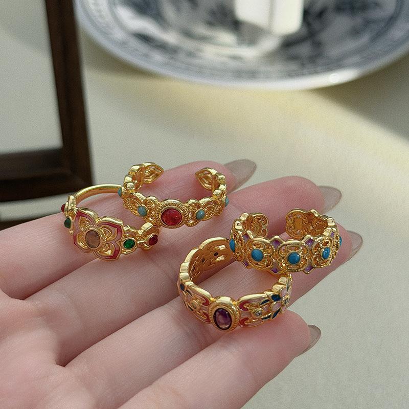 National Tide Style Retro Enamel Color Open Ring Medieval Vintage Flower Niche High-End Ring