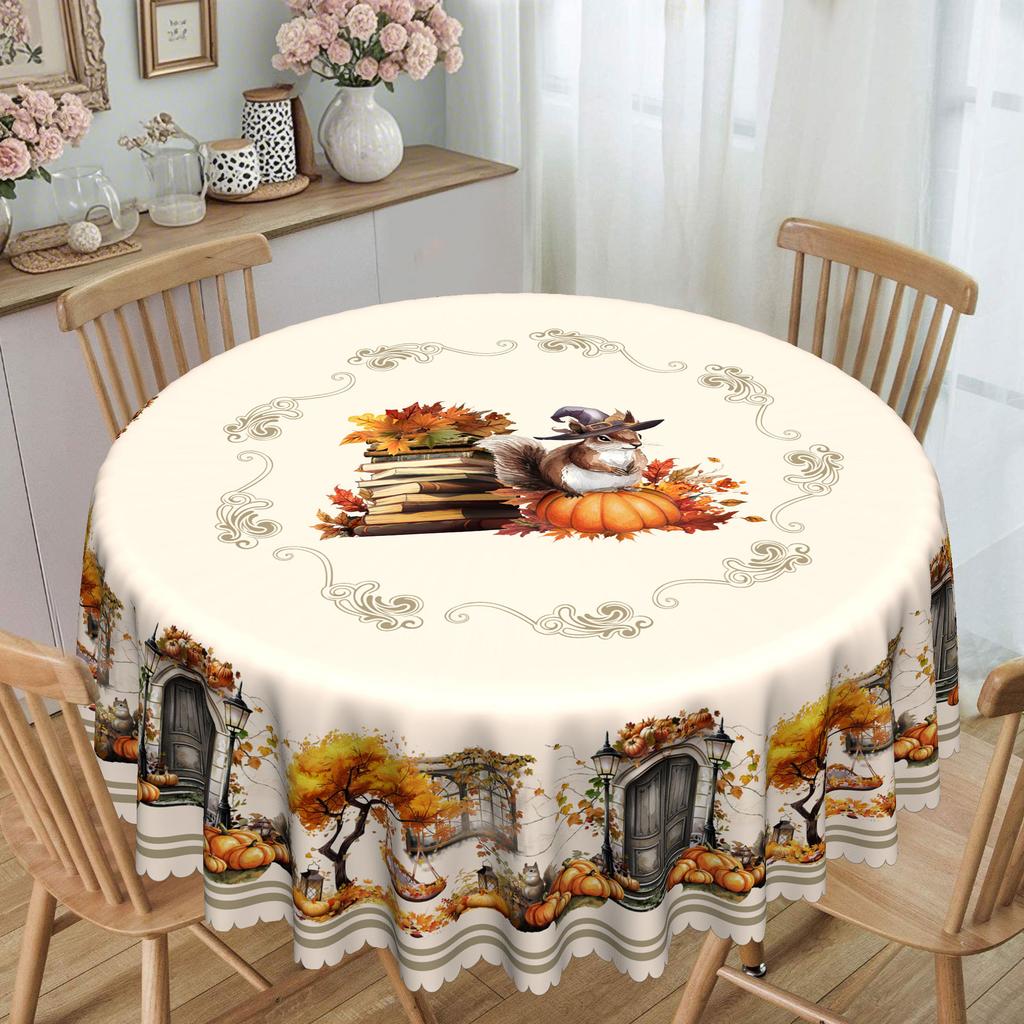 Mori Tablecloth, Autumn Squirrel Pumpkin Pastoral Print, Waterproof And Oil-Proof Round And Rectangular Tablecloth