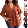 Damenmode Lässig V-Ausschnitt Knopfleiste Plissiertes T-Shirt mit kurzen Ärmeln in Unifarbe