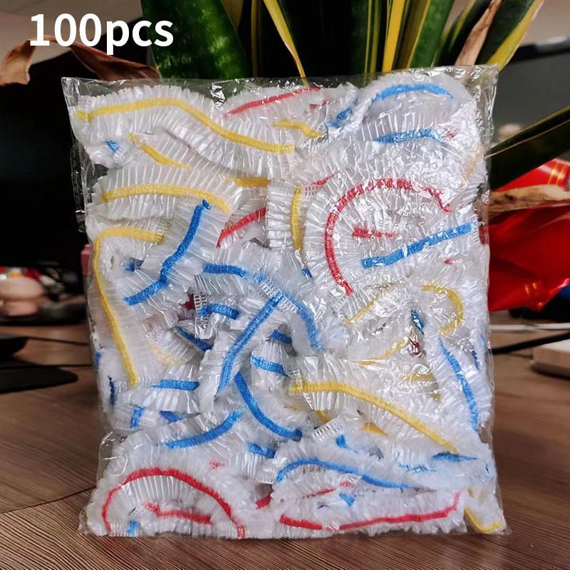 100 Stück Bunte Einweg-Lebensmittelabdeckung Obst-Lebensmittelabdeckung Elastischer Kunststoff Duschhaube Aufbewahrungsbeutel Küchenorganisator Frischhaltefolie